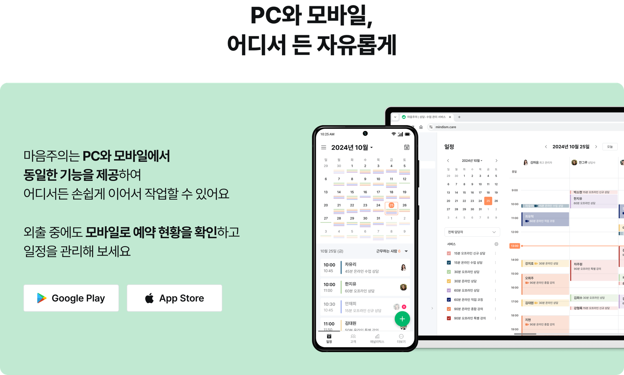 - 스마트 폰을 사용해서 어디에서든 손쉽게 마음주의를 활용할 수 있게 되었어요. 전용 앱(application)을 설치하거나 모바일 웹으로 설치 없이 접속해 자유롭게 마음주의를 사용할 수 있어요.