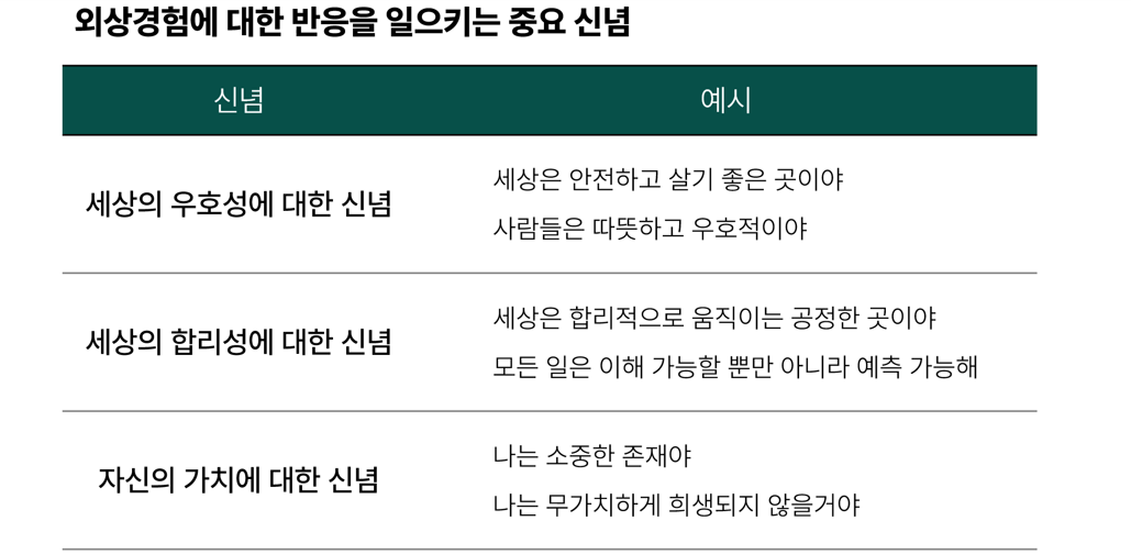 - 신념이 긍정적이었던 사람일수록 외상사건에 의해 받는 충격이 크다.