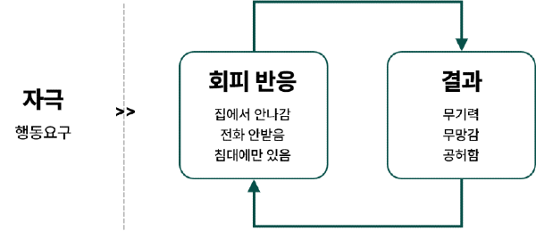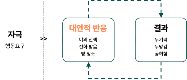 행동 활성화는 강화(reinforcement)로 설명될 수 있습니다. 우울을 경험하는 개인은 경험을 회피하려는 성향이 강합니다. 우울의 대표적인 증상인 무기력과 무망감(hopelessness)에 빠져 경험을 회피하는 빈도가 늘어나게 되면, 긍정적 자극을 받을 가능성이 줄어들게 됩니다. 이는 결과적으로 내담자의 우울감을 더욱 증가시키는 악순환을 만들게 됩니다.