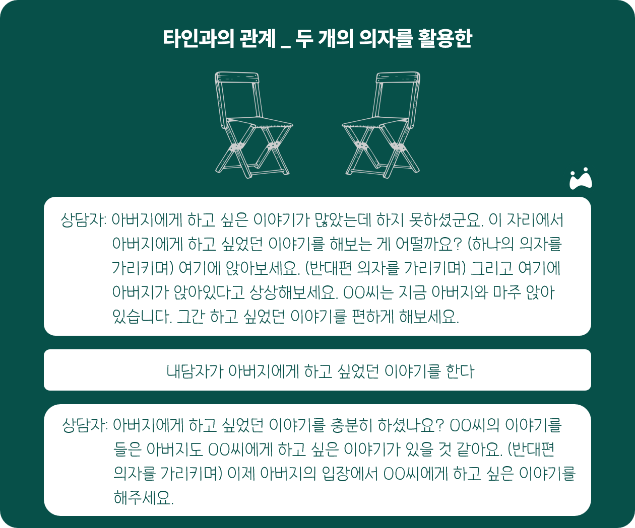 - 빈 의자 작업 초기에 상담자가 상대방(혹은 부분 자기) 역할을 담당해 진행해주는 것도 좋은 방법이다(예: 내담자 아버지의 목소리를 대신 내어주는 것).