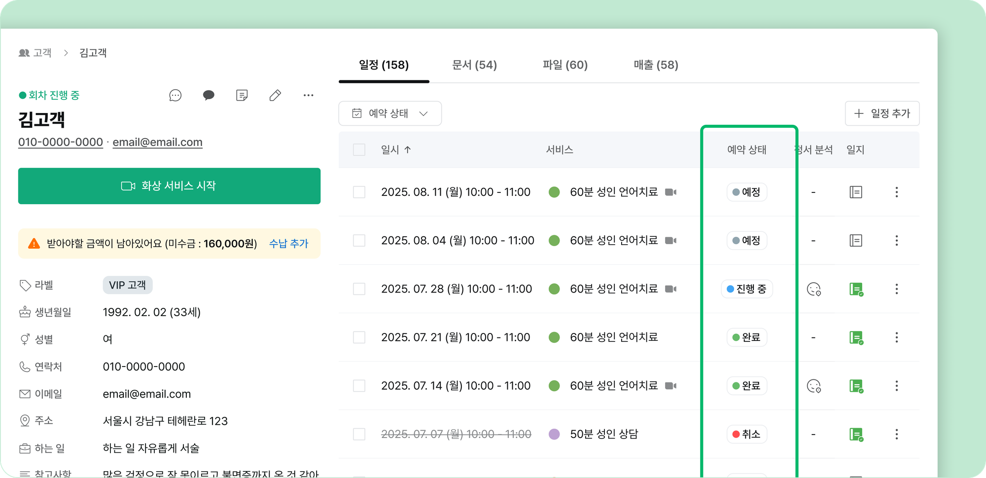 - 체계적인 고객 관리: 신규 고객 등록부터 상담/수업 히스토리(회차), 고객 상태(진행/완료)까지 한눈에 파악하고 관리하세요.