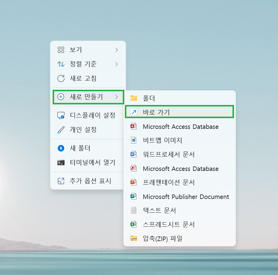 1. PC 윈도우 바탕 화면 빈 곳에 마우스 우클릭을 하여 [새로 만들기]→ [바로 가기]를 눌러보세요