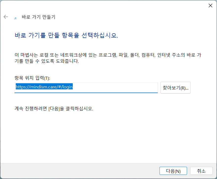 2. 마음주의 로그인 링크 (https://mindism.care/#/login)을 타이핑하고 [다음] 버튼을 누르세요