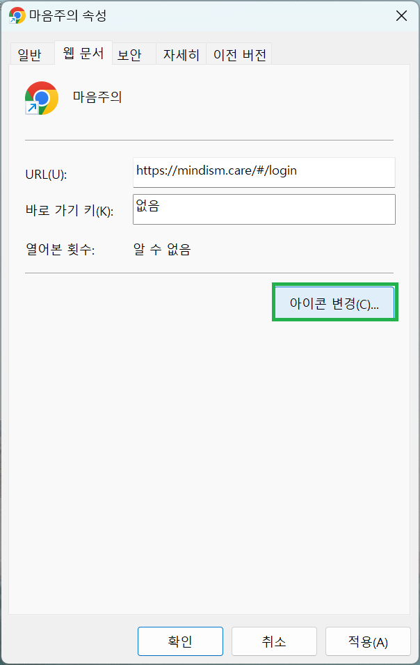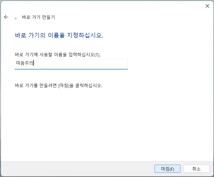 3. 아이콘의 이름을 ‘마음주의’로 입력하고 [마침] 버튼을 눌러주세요