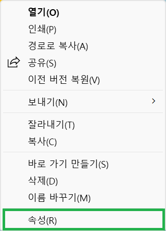 4. 만들어진 ‘마음주의’ 아이콘에 마우스 우클릭을 하신 후, [속성]을 클릭해주세요. 그리고 [아이콘 변경] 을 눌러주세요