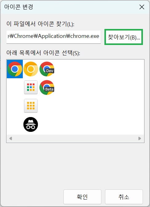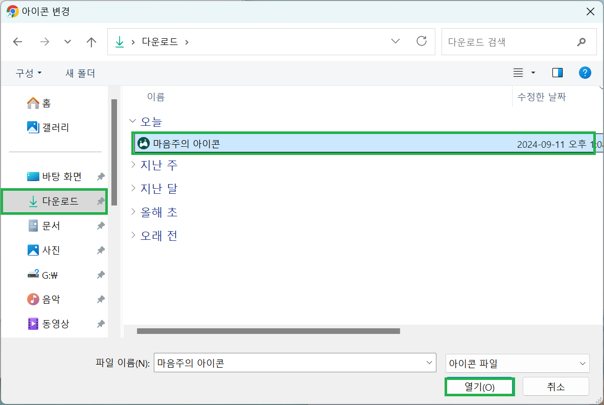5. [찾아보기]를 클릭 후, 다운로드 폴더에서 다운받으신 ‘마음주의 아이콘’을 선택하고 [열기] 버튼을 눌러주세요
