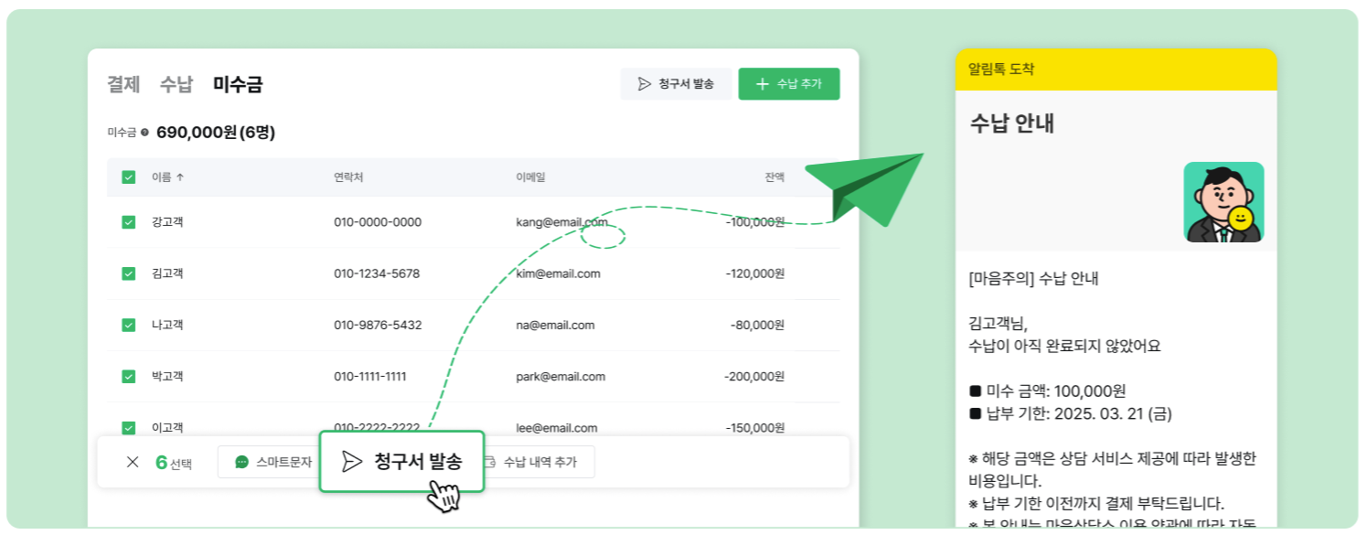 마음주의 매출관리 대시보드에서 클릭 몇 번으로 결제선생을 통해 카카오페이 모바일 청구서를 즉시 발송할 수 있습니다. 이는 고객에게 체계적이고 전문적인 이미지를 주면서, 미납금을 자연스럽게 상기시키는 가장 효율적인 방법입니다.