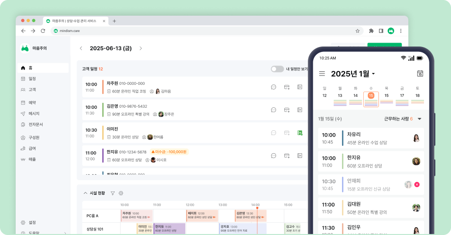이미 수많은 심리상담센터, 필라테스 1인샵, 보컬 레슨 스튜디오 원장님들이 마음주의를 통해 운영 효율을 극대화하고 서비스에 집중하고 있습니다.