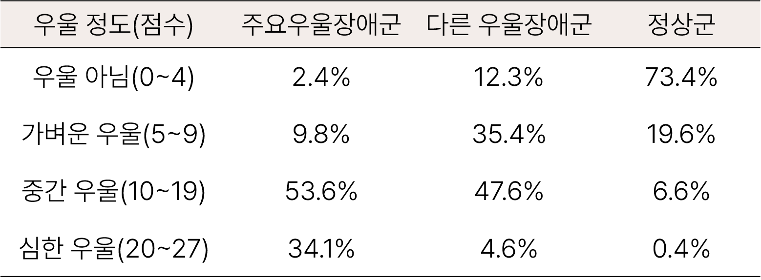 - PHQ-9의 높은 점수가 곧 우울장애 진단으로 이어지는 것은 아니다.
