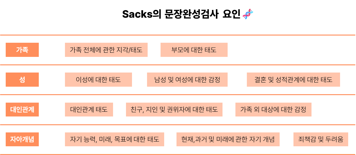 - 문장완성검사는 현재 다양한 형태로 활용되고 있다. 대표적으로 활용되고 있는 Sacks의 문장완성검사(SSCT)의 경우 가족, 성, 대인관계 및 자아개념의 4개 영역에 관한 문장으로 구성되어 있다.