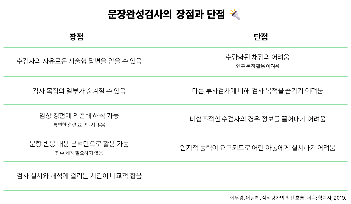 - 대부분의 투사 검사가 그러하듯 문장완성검사 또한 신뢰도 및 타당도에서 만족할만한 수준은 아니다. 따라서 해당 검사에서 나온 결과는 객관형 검사 혹은 목적에 맞는 별도의 검사와 비교검증을 통해 보수적으로 해석되어야 한다.