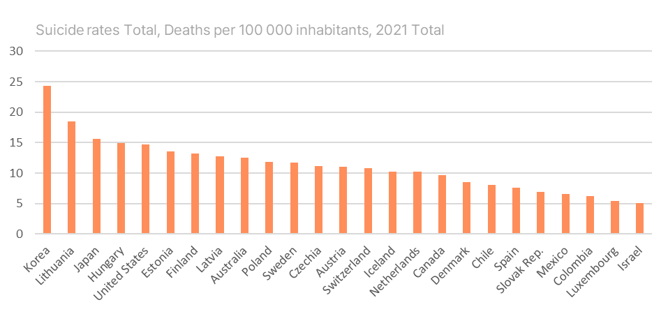 대한민국은 OECD 자살률 1위로 10만 명당 24.3명으로, OECD 평균인 11.24명의 2배 이상 높고, 일본보다도 1.56배 높은 수치입니다. 이는 자살 문제의 심각성을 다시금 상기시킵니다.
